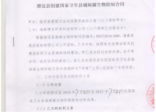 公司成立以來,在省內(nèi)參與了多項重大活動,如:承包澄邁縣城、樂東縣城、白沙縣城創(chuàng)建省級衛(wèi)生縣城、創(chuàng)建國家衛(wèi)生縣城中的病媒生物防制工作;承包??谑小|方市創(chuàng)建國家衛(wèi)生城市、創(chuàng)建省級衛(wèi)生城市中的病媒生物防制工作等。運用多年來公司在創(chuàng)衛(wèi)過程中摸索及總結(jié)出來的方法及操作模式,致力于創(chuàng)衛(wèi)工作。