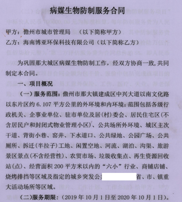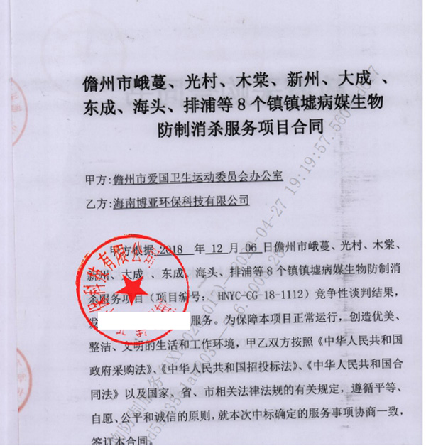 ④、儋州市:2018-2020年間參與了儋州市峨蔓、光村、木棠、新州、大成、東成、海頭、排浦等8個鎮(zhèn)鎮(zhèn)墟病媒生物防制消殺服務(wù)項目及儋州市建城區(qū)的病媒生物防制服務(wù)。