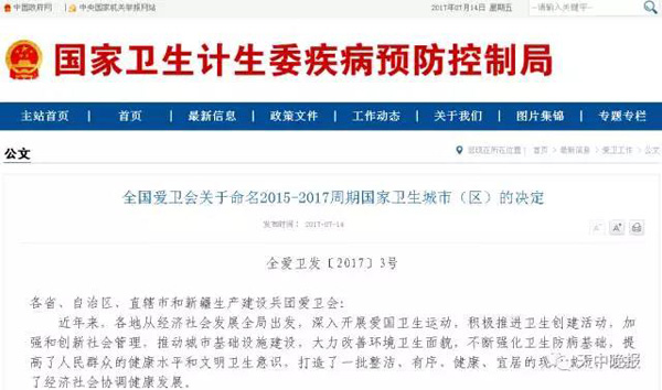獲得“國家衛(wèi)生城市”榮譽稱號